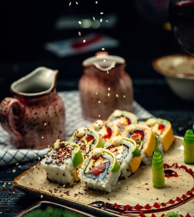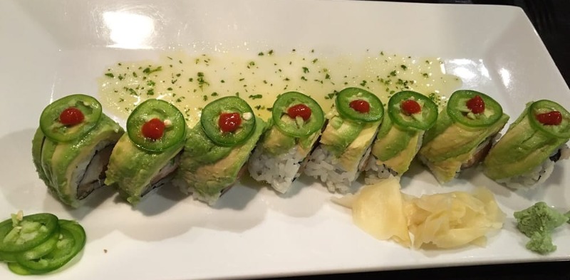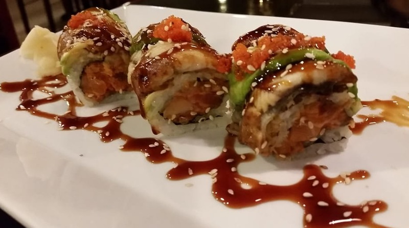 Tea House Asian Bistro Have You Tried Our Dinosaur Roll Softshell Crab And Cucumber Inside Topped With Eel Avocado Tobiko Eel Sauce And Sesame Seeds Yum Facebook
